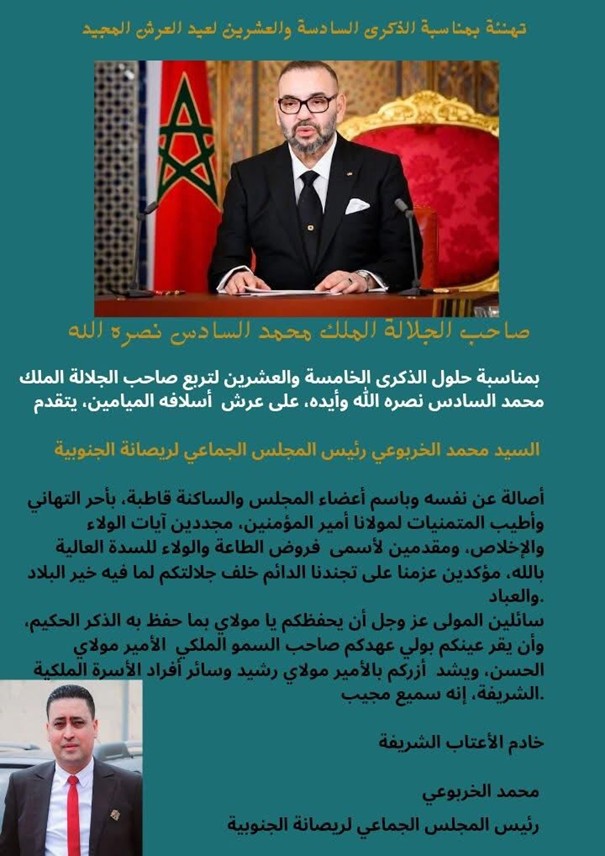 بمناسبة حلول الذكرى السادسة والعشرين لتربع صاحب الجلالة الملك محمد السادس نصره الله وأيده، على عرش أسلافه الميامين، يتقدم السيد محمد الخربوعي رئيس المجلس الجماعي لريصانة الجنوبية ،أصالة عن نفسه وباسم أعضاء المجلس والساكنة قاطبة، بأحر التهاني وأطيب المتمنيات لمولانا أمير المؤمنين، مجددين آيات الولاء والإخلاص، ومقدمين لأسمى فروض الطاعة والولاء للسدة العالية بالله، مؤكدين عزمنا على تجندنا الدائم خلف جلالتكم لما فيه خير البلاد والعباد.