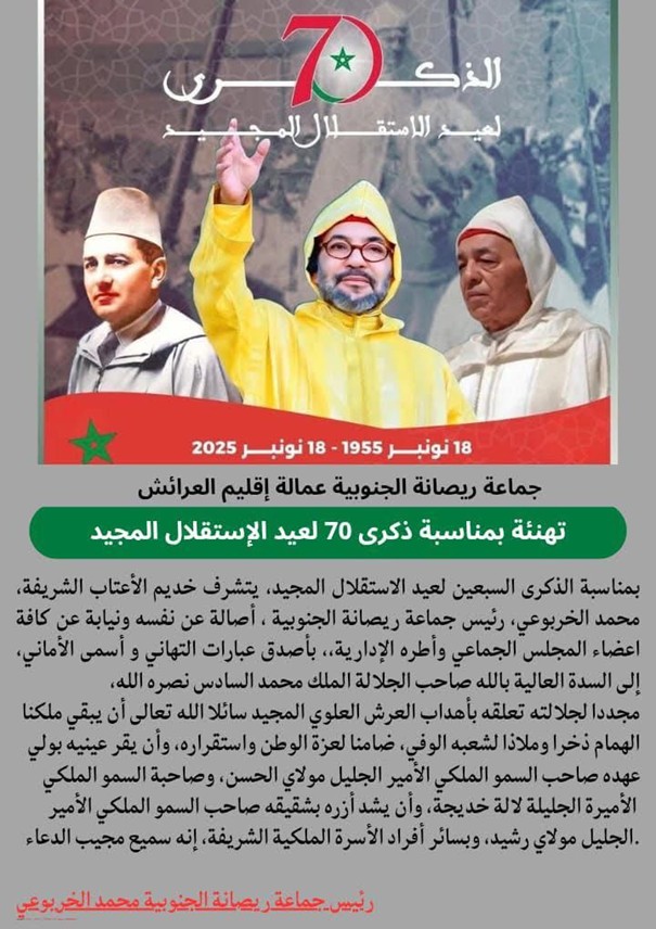 بمناسبة الذكرى السبعين لعيد الاستقلال المجيد، يتشرف خديم الأعتاب الشريفة، محمد الخربوعي، رئيس جماعة ريصانة الجنوبية اقليم العرائش ، أصالة عن نفسه ونيابة عن كافة اعضاء المجلس الجماعي وأطره الإدارية،، بأصدق عبارات التهاني و أسمى الأماني، إلى السدة العالية بالله صاحب الجلالة الملك محمد السادس نصره الله،